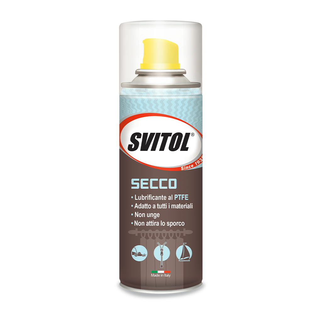 SVITOL SECCO Lubrificante al PTFE, per parti metalliche, plastiche, legno, cuoio, gomma, vetro e superfici verniciate. Crea una pellicola asciutta, a lunga durata, che permette di prevenire ed eliminare usura e attriti. Ha un basso coefficiente di attrito, un’ottima adesione alle superfici e resiste alle intemperie.
